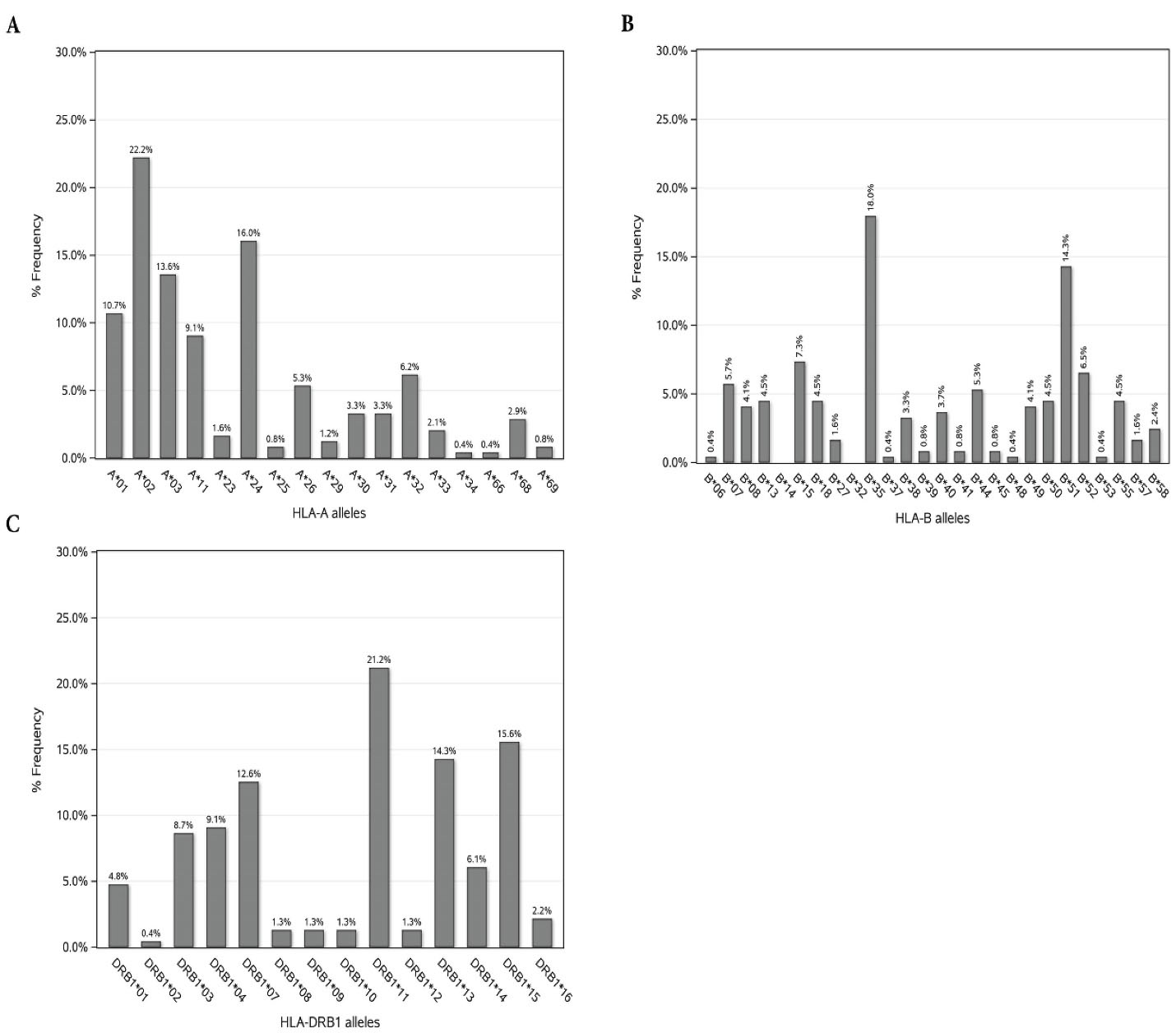 Allogeneic hematopoietic stem cell transplantation (allo-HSCT) is a promising therapy for many hematological malignancies and disorders.1 Despite the advances in pre- and post-transplant supportive care, allo-HSCT remains associated with substantial transplant-related mortality. Graft-versus-host disease (GVHD) represents the highest frequency in mortality following allo-HCT.2 Host tissue damage induced by conditioning regimens releases inflammatory cytokines and activates various subsets of immune cells, including antigen presenting cells, T cells, and natural killer cells, which are involved in the pathophysiology of GVHD.3 Donor immune cells that exist in grafts from different stem cell sources such as bone marrow, mobilized peripheral blood, and cord blood can induce GVHD reactions after transplantation. Moreover, allo-reactive T-cells are known as a dominant subset of immune cells to moderate GVHD. CD4 + T and CD8 + T cells are two main allo-reactive T cell subtypes which recognize exogenous and endogenous molecules presented on the major histocompatibility complex (MHC) class II and MHC class I molecules, respectively.3 MHC, also called human leukocyte antigen (HLA), is the most polymorphic protein in the body with many various subclasses in each population.4 Regarding their frequent expression in all nucleated cells and high immunogenicity, HLAs are the most important antigens in transplantation. In case of HLA miss-match transplantations, they can serve as a foreign antigen provoking immune reactions causing graft-failure or GVHD.5 Therefore, matched HLA antigens at A, B, C, DRB1, and DQB1 locus between recipient and donor as well as prescribing immunosuppressive regimens have been considered to limit GVHD occurrence.6 In spite of this strategy, GVHD occurs in approximately 30% of the patients who undergo allo-HSCT from HLA-matched related donors. This rate is roughly 70% for patients with HLA-matched unrelated donors.7 With regards to GVHD developing even in the HLA-identical sibling allo-HSCTs, some studies evaluated the possible association between the presence or absence of specific HLA antigens and GVHD incidence in HLA-matched related and unrelated donors. More frequent HLA alleles which either increase or decrease the incidence of GVHD in HLA-identical sibling transplantations were reported in various populations.8,9 However, some studies did not find any change in the risk of GVHD through HLA antigens after bone marrow transplantation from HLA-identical sibling.10 In the current study, we investigated any possible association of HLA subclasses and acute/chronic GVHD occurrence as well as OS in patients receiving HLA-matched sibling allo-HSCT.