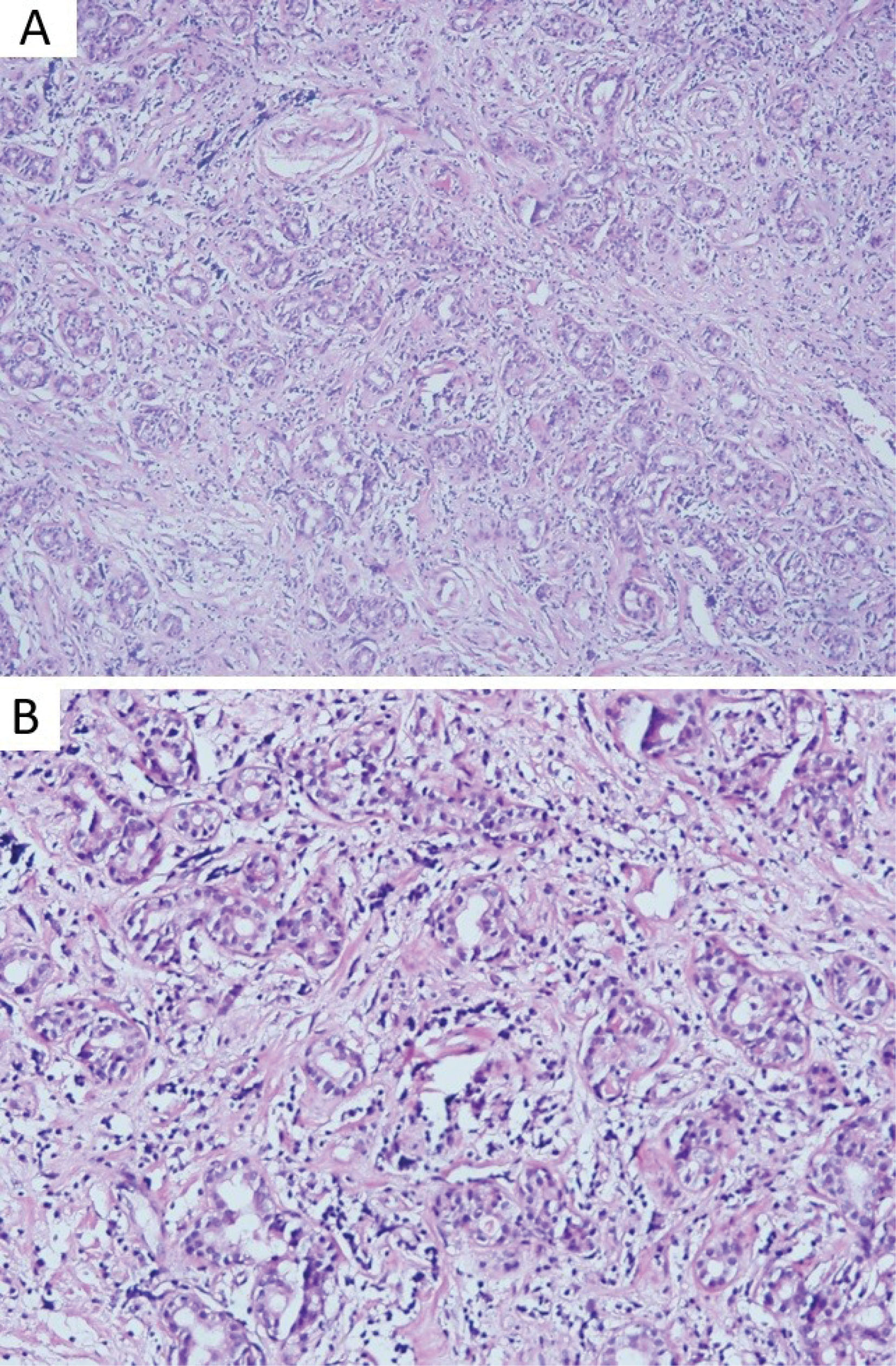 Chronic Dacryoadenitis. (A) Histopathologic findings show the lacrimal gland infiltrated by inflammatory cells and destruction of lacrimal gland in low power (Hematoxylin and Eosin stain, ×100). (B) High power (×200) shows polymorphous infiltration of chronic inflammatory cells consistent of lymphocytes, plasma cells and few eosinophils, also the lacrimal gland is also surrounded by fibrotic tissue (Hematoxylin and Eosin stain).