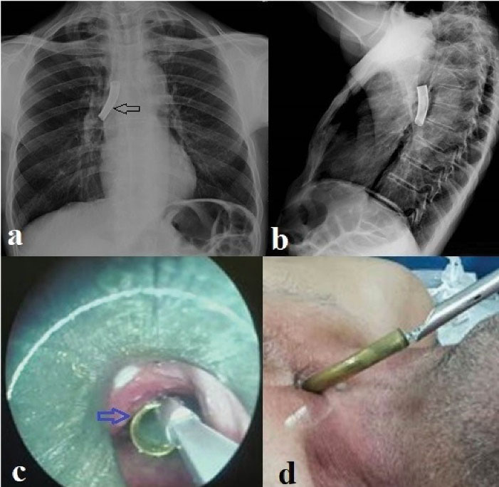 Chest x-ray and computerized tomography of thorax (CT) are the most commonly used radiological examinations in foreign body aspiration. Radiopaque foreign bodies can be seen directly in radiological examinations. Indirect findings such as air trapping, mediastinal shift, emphysema, and atelectasis can be seen in non-radiopaque foreign bodies.11 Some studies have reported that no findings were found on chest radiograph in patients with foreign body aspiration.12 In our study, all cases were evaluated with chest radiographs. The foreign body was observed in 26.9% of the cases evaluated only by chest radiography. A radiopaque metallic body was observed in the evaluation of PA chest radiographs of our patients who aspirated the tracheostomy cannula. In our patients who aspirated cleaning brushes, only metallic parts of the brushes were opaque, which could be partially evaluated on PA chest radiography (Figure 2). Indirect findings were observed in 15.4% of the chest radiographs. Air trapping was the most common inductive finding. Thorax CT is the radiological examination with the highest diagnostic value in foreign body aspiration. In our study, the localization of the foreign body was detected in all cases evaluated with thorax CT. Since the prosthesis was partially opaque in our patients who aspirated a voice prosthesis, no finding was observed on the posteroanterior chest radiograph in most cases. Voice prostheses were observed as opaque foreign bodies on thorax computed tomography.