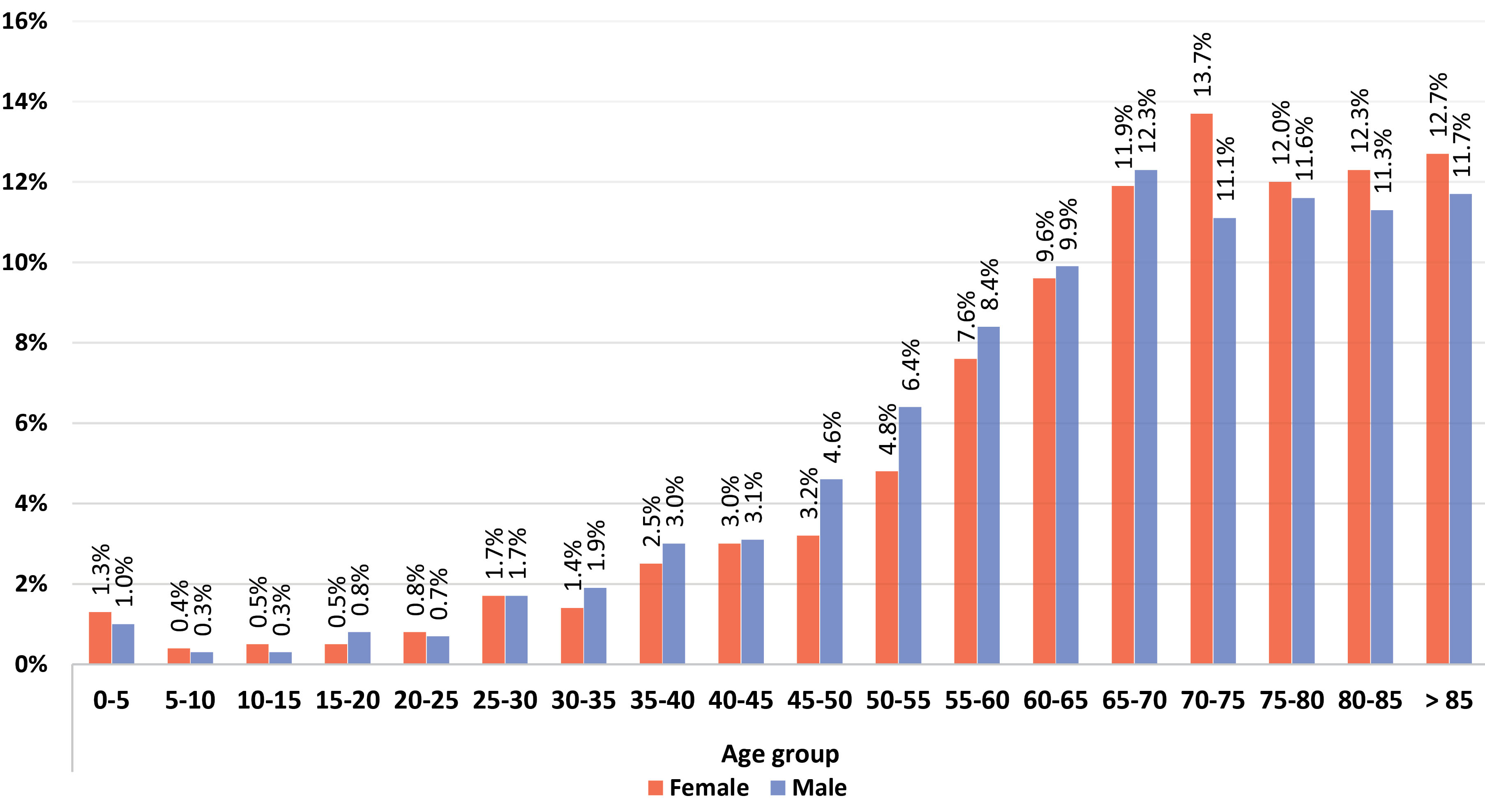 Around 60.9% of deaths occurred in men. The mean age of death was 67.37 ± 18.63 years in women and 66.17 ± 18.04 years in men. Figure 3 shows in–hospital mortality across age groups and genders.