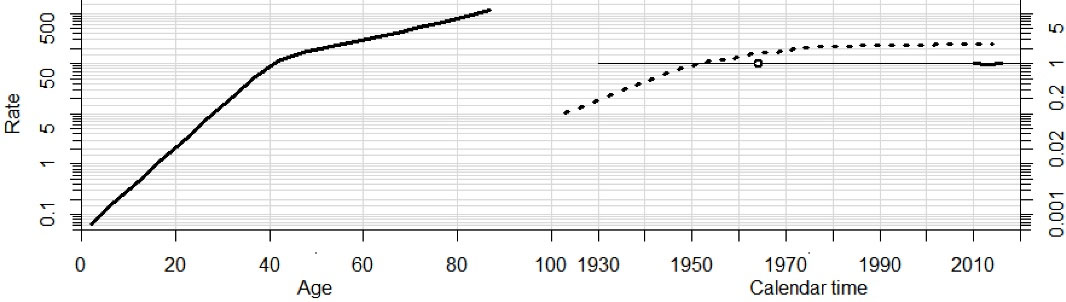 In the birth cohort effect (the dotted line in the middle), after adjustment for age and period indices, the incidence rate of breast cancer increased, as far as the women born before 1950, after which it had a stable trend until 1980. Afterwards, it started to decrease in more recent birth cohorts.
