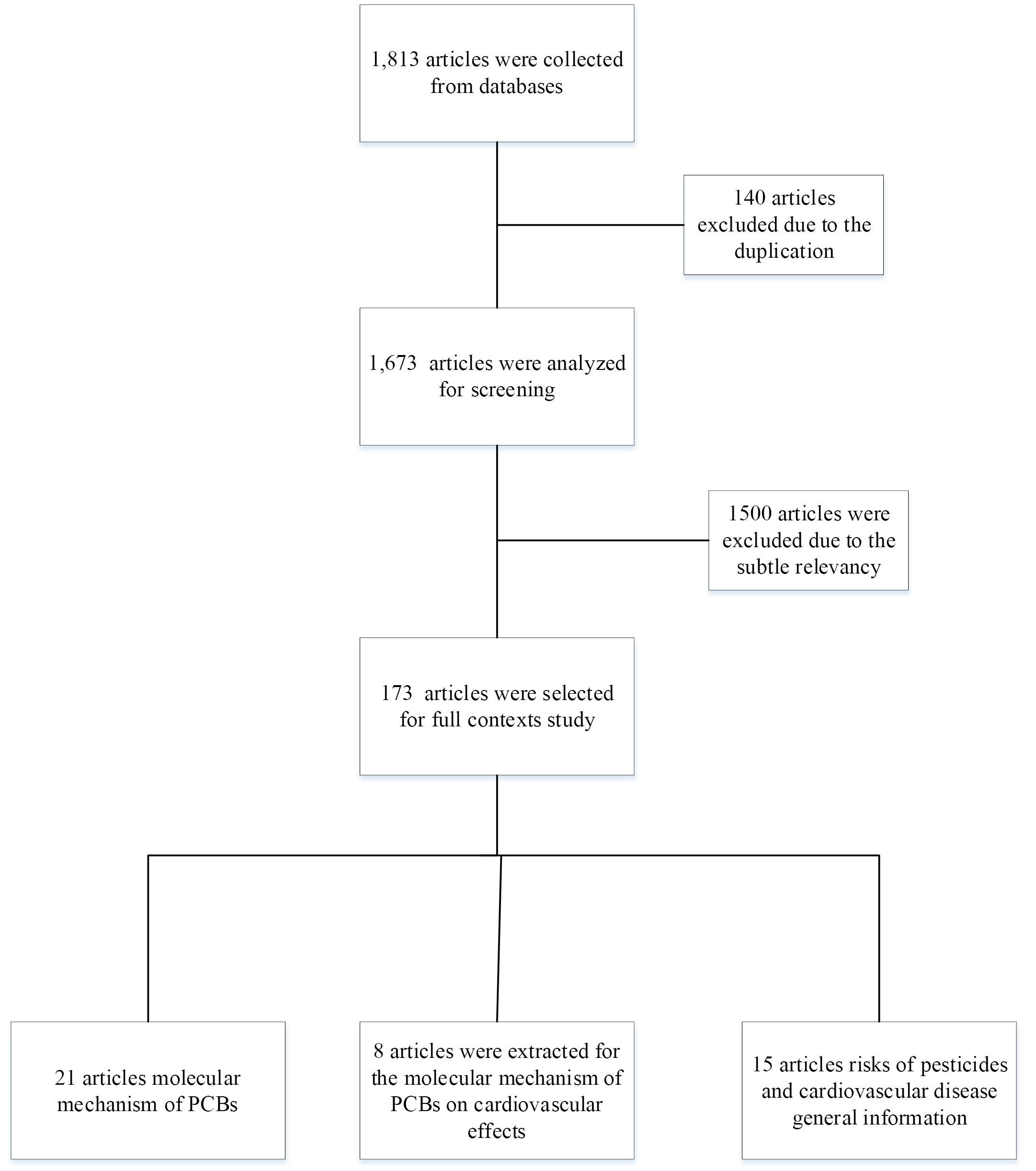 Two researchers independently screened the titles and abstracts of all identified studies to find potentially relevant articles. The studies were considered qualified if they met all of the following inclusion criteria: 1) Studies that evaluated the relationship of organochlorine pesticides and PCBs with the incidence of CVDs or the establishment of risk factors leading to CVDs; and 2) studies that addressed the molecular mechanism of the cardiovascular effects of organochlorines pesticide and PCBs.