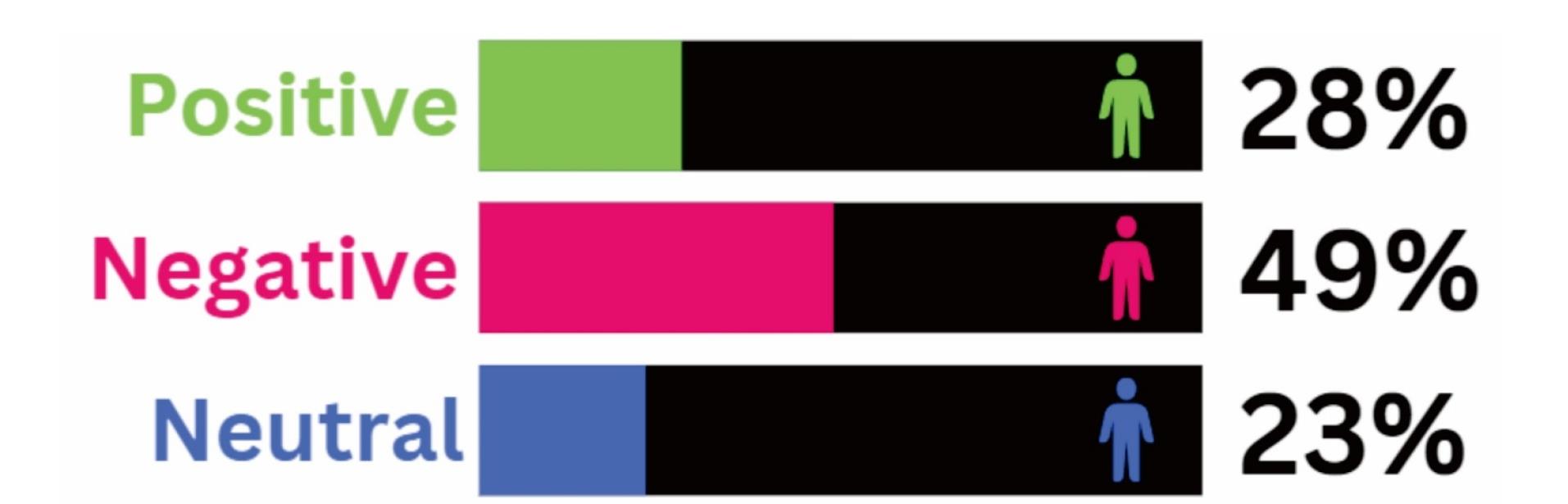 Sentiment analysis using Azure Machine Learning indicated that most of the tweets we collected (49%) were negative, suggesting significant concern, frustration, and possibly fear associated with long COVID (Figure 4). Only 28% of the tweets reflected a positive sentiment, which could demonstrate that there is still much uncertainty around the long-term effects of COVID-19 and/or that many people are still struggling with the ongoing impact of the disease. The final 23% of the tweets were neutral, simply presenting factual information, personal experiences, and opinion pieces, for example. Overall, the sentiment analysis results provide insight into the emotions and opinions of Twitter users related to long COVID, which could help in understanding public perceptions and attitudes toward the disease.