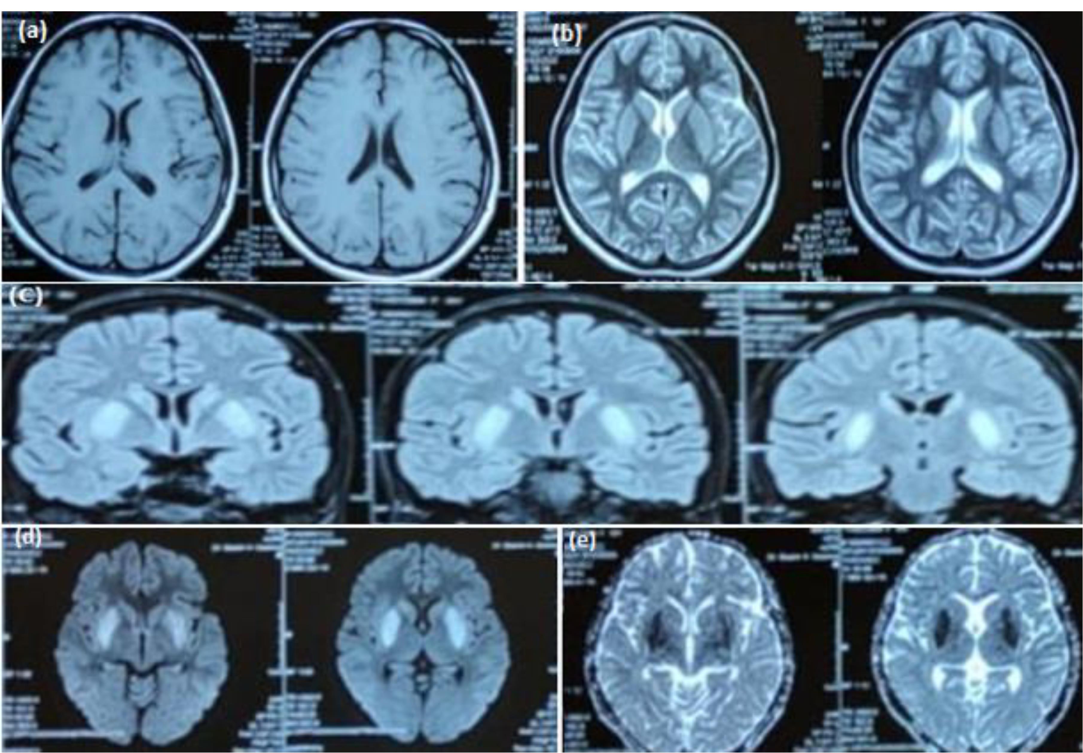 (a) T1 axial view showing hypo-intense signals in bilateral basal ganglia, T2 axial view (b) and FLAIR coronal view (c) showing hyper-intense signals in bilateral basal ganglia, DWI (d) showing diffusion restriction in the region of basal ganglia along with a signal drop out on ADC image (e)